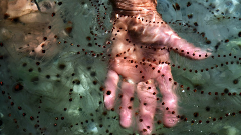 Los bañistas de Corinto se llevaron una sorpresa cuando encontraron el agua de la playa repleta de puntitos y el con una textura gelatinosa. Muchos pensaron que era una plaga de medusas, aunque su forma no se correspondía del todo. En realidad, el mar del Peloponeso estaba cubierto de salpas, como se conoce popularmente a estos organismos. Las salpas viven solas o en comunidades y, aunque algunas especies tienen solo unos pocos milímetros de largo, otras crecen hasta 25 centímetros. Se alimentan de fitoplancton, y su presencia en determinazas zonas marinas se debe a la abundancia de estas algas microscópicas. Podría decirse que las salpas no paran de comer, lo que, unido a su rápido crecimiento y a su reproducción explosiva y asexual, rápidamente clona y crea docenas de nuevos individuos que van encadenándose en ocasiones hasta formar largos cordones que, sin embargo, conviven en total armonía. No son venenosas, no pican y son totalmente inofensivas.