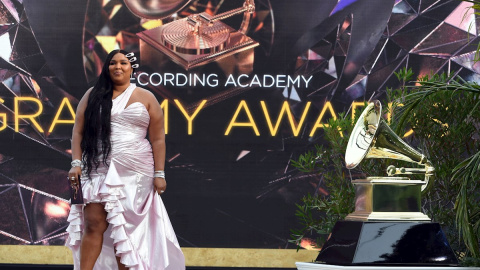 La rapera Lizzo llega a los Grammy con un vestido blanco.