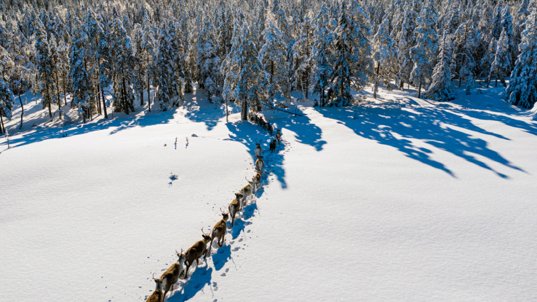 Hasta no hace tanto, los lince, los glotones y las águilas que cazaban a sus animales eran la principal preocupación de los pastores de renos de la comunidad indígena sami, en Suecia, cuando acompañaban a sus renos a buscar pastos durante el invierno. En esta vista aérea, puede verse el camino de un rebaño de renos leonados migrando a su nueva ubicación de temporada, cerca de Örnsköldsvik en el norte de Suecia. A los pastores Margret Fjellstrom y Daniel Viklund, una pareja de la comunidad indígena sami de Suecia, con cientos de renos leonado, ahora les preocupa una nueva amenaza, el cambio climático, fundamental para su comunidad, ya que las aldeas sami se someten a la Ley sueca de cría de renos y no pueden dedicarse a otras actividades económicas distintas.
