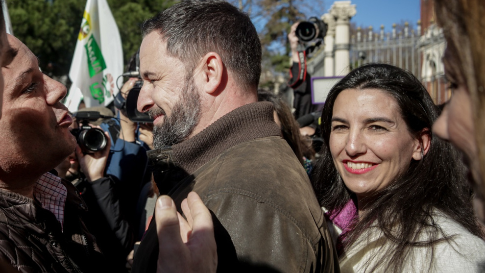 Abascal ha acudido junto a la presidenta de Vox Madrid, Rocío Monasterio, y el portavoz de la formación en el Congreso de los Diputados, Iván Espinosa de los Monteros, a la concentración para ilustrar su apoyo al sector de la agricultura.