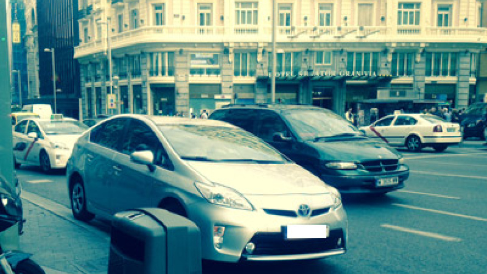 *Nota de la redacción: La fotografía que ilustra esta información corresponde al Toyota aparcado en la Gran Vía de Madrid que siguió al Ford azul en el que iba Esperanza Aguirre. Sin tener constancia directa, la primera versión de esta noticia afirmaba en un primer momento que Aguirre había descendido de su interior.