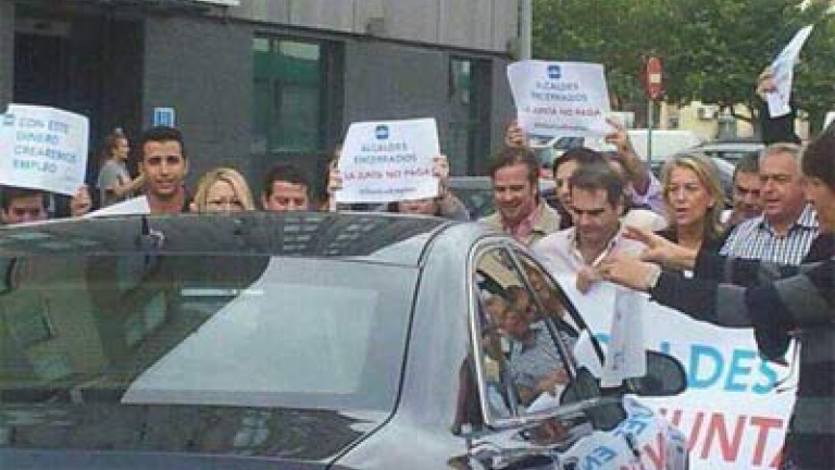 Un grupo de alcaldes populares de Málaga han protestado este sábado en la puerta del hotel donde la presidenta de la Junta de Andalucía, Susana Díaz, presentaba los actos de conmemoración del décimo aniversario del Museo Picasso Málaga (MPM). Con pancartas en las que se leía "Alcaldes encerrados. La Junta no paga", los dirigentes populares -ediles y concejales de municipios menores de 25.000 habitantes— exijían a la Junta el pago de la deuda, que cifran en más de 16,7 millones.