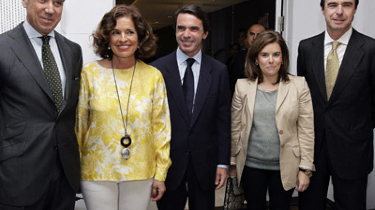 Hoy, Aznar ha llegado al Club Siglo XXI muy sonriente y acompañado por la vicepresidenta del Gobierno y el ministro de Industria, los dos miembros del Ejecutivo de Mariano Rajoy que han acudido a limar asperezas e intentar devolver las aguas a su cauce tras varias semanas de controversia por las críticas que el presidente de Honor del PP dirigió a su sucesor. El vicesecretario general Carlos Floriano también ha acudido al acto introducido por el ex ministro Eduardo Zaplana, presidente del Club, que no ha ahorrado elogios a quien fue su jefe en el Consejo de Ministros.