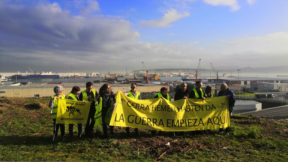 Mientras nadie sabía nada, en los alrededores del puerto de Bilbao –situado en realidad en el término municipal de Santurtzi, a unos 15 kilómetros de la capital vizcaína–, varias personas desplegaban una pancarta amarilla con un lema en euskera y castellano. "Gerra hemen hasten da. La guerra empieza aquí". También llevaban una bandera de Ongi Etorri Errefuxiatuak (Bienvenidos Refugiados).