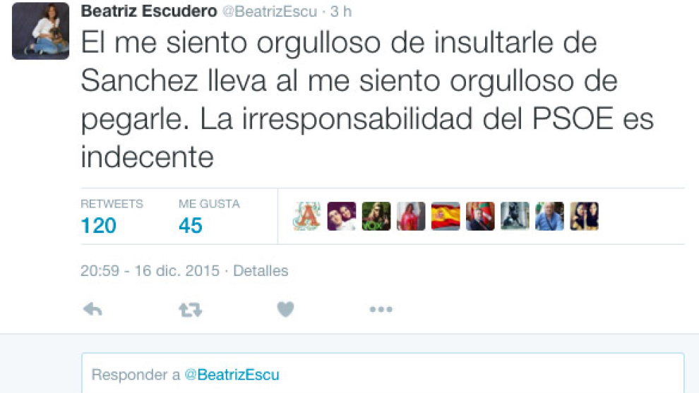 Beatriz Escudero, diputada nacional por Segovia, asegura en un tuit que "el me siento orgulloso de insultarle de Sánchez lleva al me siento orgulloso de pegarle" y acusa al PSOE de "indecente".