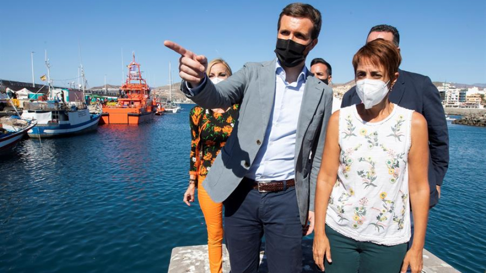 El presidente del Partido Popular, Pablo Casado, que este sábado se ha acercado el muelle de Arguineguín (Gran Canaria), donde hay 860 migrantes, ha acusado al Gobierno del colapso migratorio que se produce en Canarias, y ha criticado que se pase "del Open Arms y el papeles para todos a las devoluciones en caliente".