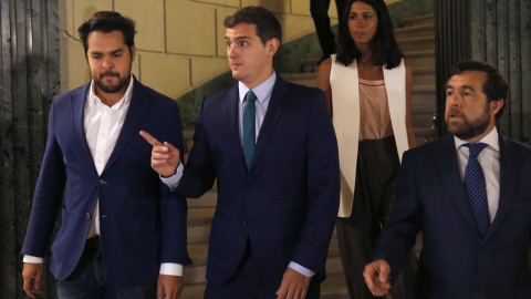 El líder de Ciudadanos, Albert Rivera,junto al secretario de Comunicación, Fernando de Páramo, y el secretario general de Ciudadanos en el Congreso, Miguel Ángel Gutiérrez , tras la reunión con el jefe del Ejecutivo en funciones, Mariano Rajoy, el pasado miércoles. EFE/Mariscal