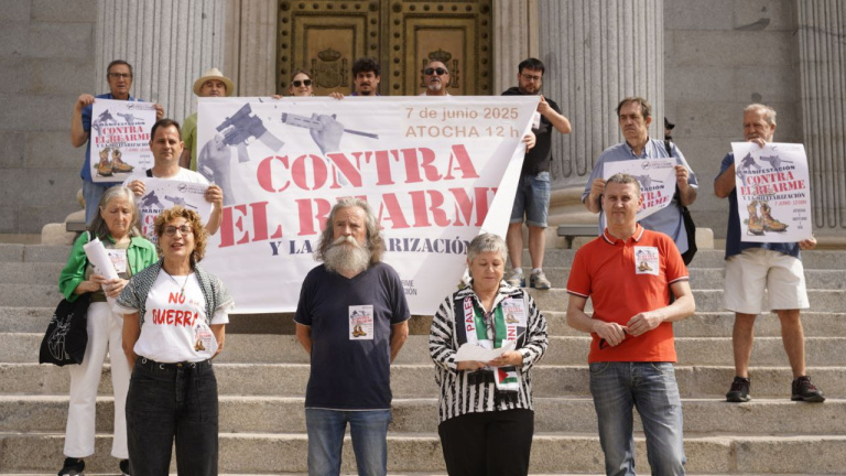 La Asamblea de Madrid contra el Rearme y la Militarización, que integra a 75 colectivos, ha animado desde las inmediaciones del Congreso de los Diputados a participar en la movilización de este sábado.