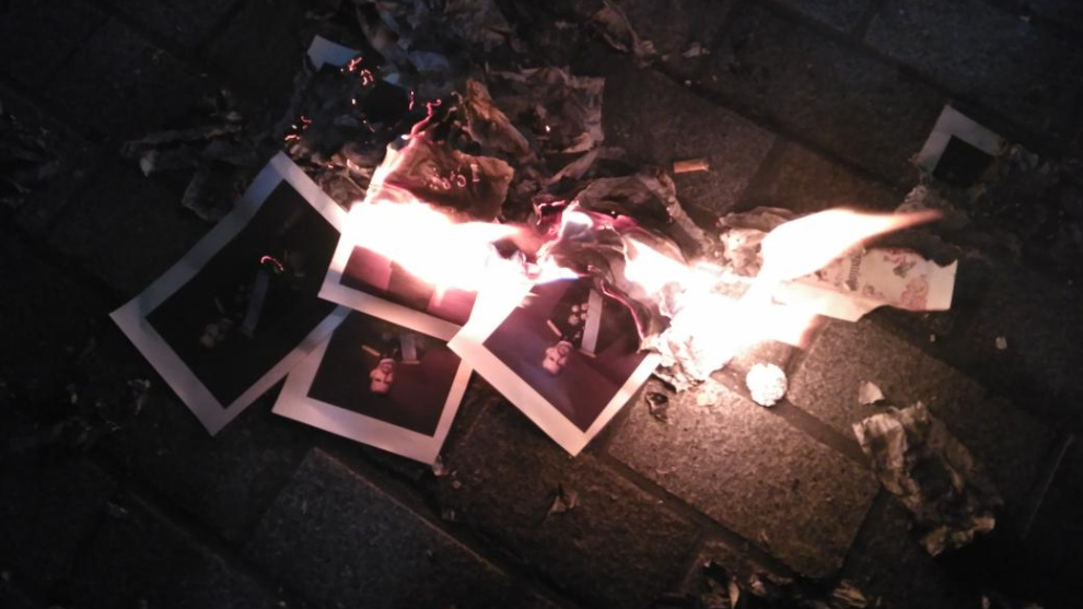 Las imágenes del rey estaban impresas en hojas de papel que, en el reverso, contenían una página de la Constitución, y fueron quemadas con antorchas que portaban algunos de los manifestantes.