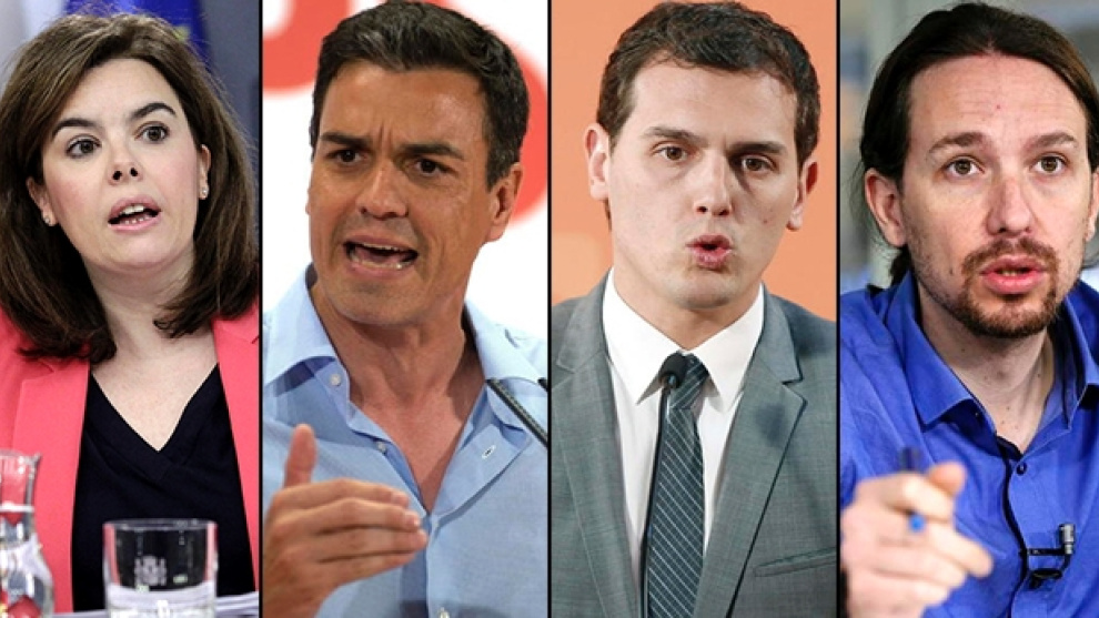MADRID.- La vicepresidenta del Gobierno, Soraya Sáenz de Santamaría, en representación del Partido Popular; y los líderes del PSOE, Pedro Sánchez; Ciudadanos, Albert Rivera; y Podemos, Pablo Iglesias, debatirán este lunes, 7 de diciembre, en el '7D: El debate decisivo' de Atresmedia de pie sin atriles y sin ningún dispositivo electrónico.