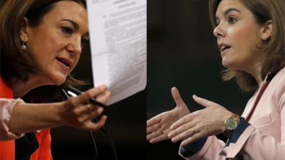 La vicepresidenta del Gobierno ha cogido el guante que le ha lanzado la portavoz socialista y le ha contestado con referencias personales sobre su futuro político en el PSOE, pendiente como está este partido de la elección inminente de un nuevo líder y una nueva dirección que afectará al propio grupo parlamentario. Y en esa senda se han enzarzado, sobre todo a la hora de lanzarse reproches. La "Soraya" socialista le ha afeado la profusión de decretos.-ley empleados por el Gobierno que `preside Rajoy pese a disfrutar de una mayoría absoluta en ambas cámaras parlamentarias..