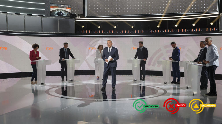 Los portavoces de las siete fuerzas políticas con grupo parlamentario propio se han enfrentado este jueves en el debate a siete organizado por Radiotelevisión Española. El debate ha permitido confrontar posturas en torno a cuatro bloques temáticos, con intercambios de datos y cruces de acusaciones en materia política, social y económica. En VerificaRTVE contrastamos con datos los principales mensajes de los portavoces.