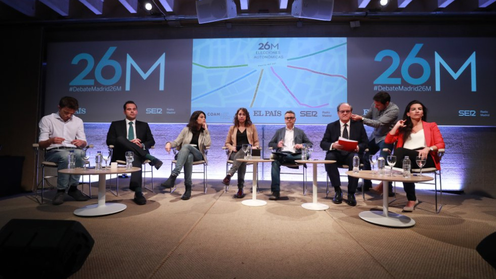 Ángel Gabilondo (PSOE), Ignacio Aguado (Ciudadanos), Isabel Serra (Unidas Podemos - Izquierda Unida - Madrid en Pie), Iñigo Errejón (Más Madrid) y Rocío Monasterio (Vox) participan en el debate electoral de candidatos a la Comunidad de Madrid que organizan EL PAÍS y Cadena SER con la colaboración del Colegio Oficial de Arquitectos de Madrid (COAM).