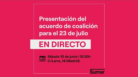 Política GobiernoPartidosCongresoTribunalesInteriorMemoria Pública Este artículo se publicó hace 3 años.Directo | Yolanda Díaz presenta el acuerdo de Sumar para el 23JLa vicepresidenta segunda y ministra de Trabajo y Economía Social, Yolanda Díaz, atiende a los medios en Madrid, a 17 de mayo de 2023. Rodrigo Jimenez / EFETamaño de letraColor de fondoComparteComentaPúblico 10/06/2023 12:51Tamaño de letraColor de fondoComparte0ComentaPublicidad Ver vídeo ComparteEtiquetasSumarComentarios de nuestros socias/os¿Quieres comentar?Para ver los comentarios de nuestros socias y socios, primero tienes que iniciar sesión o registrarte. Escribe tu comentarioRecuerda las normas de la comunidad.Enviar Descartar