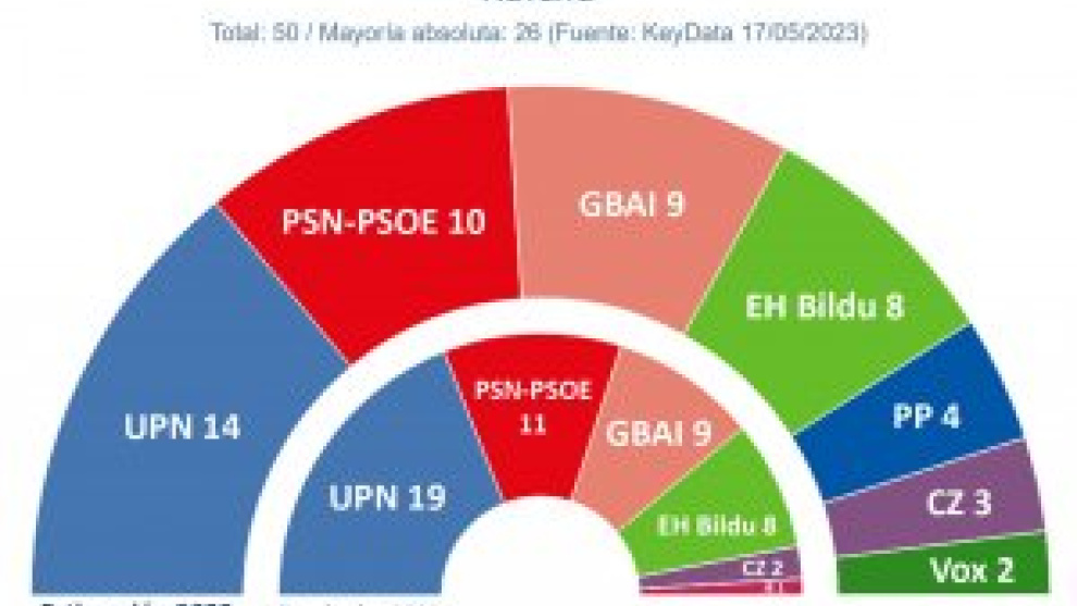Unión del Pueblo Navarro es la primera fuerza en el estudio de Key Data con una estimación de voto del 25,7% y una proyección de 14 escaños. En los comicios regionales de 2019, UPN acudió en coalición con el Partido Popular y Ciudadanos bajo la marca de Navarra Suma, que en aquel momento ganó las elecciones con 19 asientos en el Parlamento.