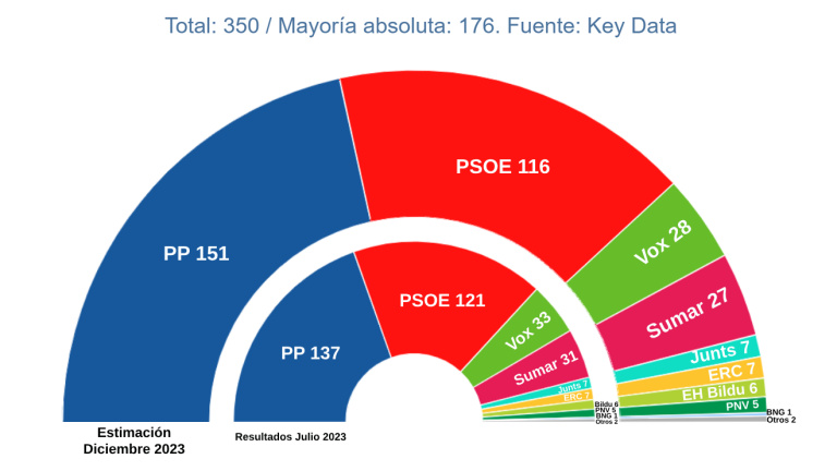 En el estudio de Key Data de diciembre los de Feijóo obtienen una estimación de voto del 36,4%, y se mantienen en ascenso prácticamente desde el verano. Con este porcentaje, el PP obtendría alrededor de 151 escaños; esto supone tres puntos y 14 escaños más respecto a lo que lograron en el 23J.
