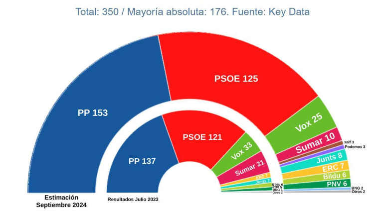 Las encuestas de septiembre señalan que los conservadores reforzarían su estimación (34,4%) y sobrepasarían ya la barrera de los 150 escaños (153). En las elecciones del 23 de julio del pasado año el PP obtuvo 137 escaños con algo más de ocho millones de votos; según las estimaciones de Key Data, los de Feijóo podrían cosechar hasta 400.000 sufragios más.
