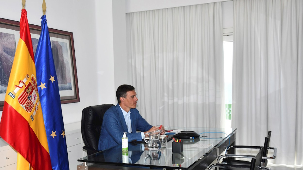 El presidente del Gobierno, Pedro Sánchez, durante la reunión de seguimiento del dispositivo de repatriación del contingente español en Afganistán. Pool Moncloa/AYOZE MORERA / EFE