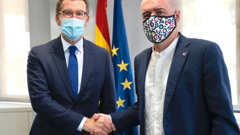 Alberto Núñez Feijóo y Unai Sordo (CCOO) en la sede del Partido Popular en Génova. Foto cedida por el PP-David Mudarra