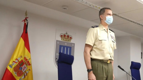 Felipe VI, con uniforme de verano de capitán general del Ejército de Tierra, solo se ha quitado la protección para su alocución final donde ha recordado los "miles de víctimas que nos ha arrebatado la pandemia y el enorme dolor y tristeza que ha causado en tantas familias españolas".
