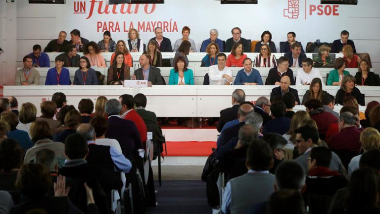 El secretario general del PSOE, Pedro Sánchez (5d), y los miembros de su Ejecutiva durante la reunión del Comité Federal hoy en Madrid, una cita determinante para ver su margen de negociación para intentar conformar una mayoría de gobierno, en el que