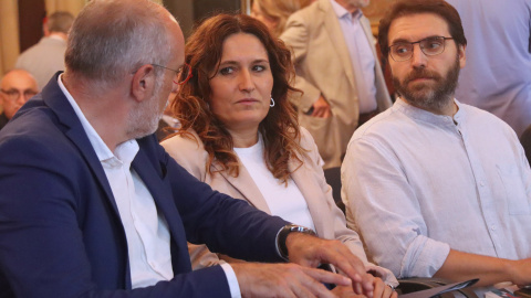 El director del Instituto de Estudios del Autogobierno, Joan Ridao; la consejera de la Presidencia, Laura Vilagrà, y el diputado del PSC, Ferran Pedret, en la presentación del informe Nico Tomás / ACN