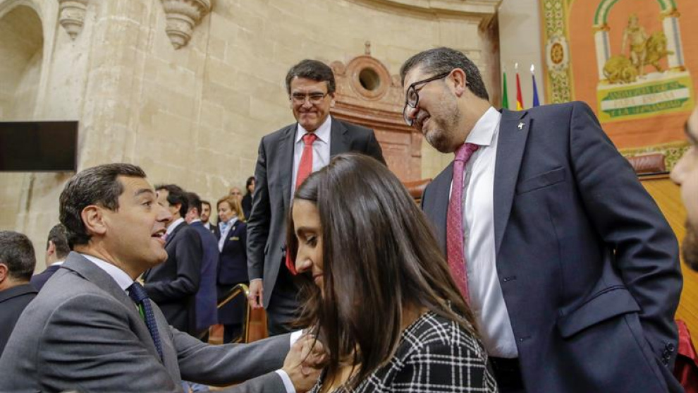 Juanma Moreno con Francisco Serrano, en el Parlamento de  Andalucía.
