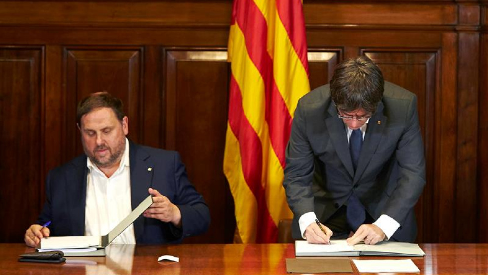 El president de la Generalitat y sus consellers firman el decreto de convocatoria de la consulta. Puigdemont ordena a los tribunales que "hagan cumplir" la ley del referéndum y a los ciudadanos que cooperen para garantizar su aplicación.