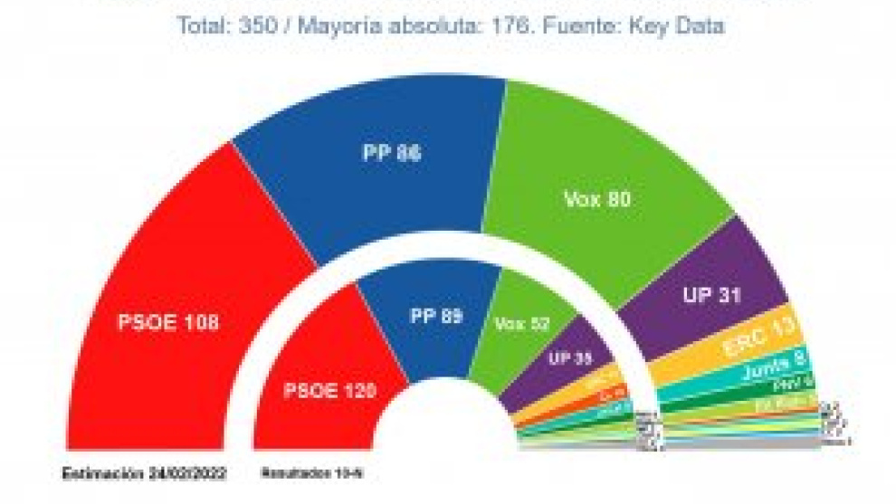Según el estudio del mes de febrero de 'Key Data' para 'Público', el PSOE obtendría 108 escaños, el PP baja a los 86 y Vox se dispara hasta los 80 escaños, superando en votos a los conservadores. Unidas Podemos obtendría 31 diputados y Ciudadanos, 2.