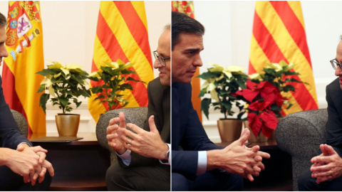 Sánchez y Torra se reunieron en un salón del palacio sentados en sendos sofás, con las banderas española y catalana tras de ellos. En medio, una mesa, con dos macetas con flores amarillas, de un tono similar al lazo que portan como reivindicación los independentistas y que también llevaba en la solapa el presidente catalán. Esa era la escenografía que encontraron los cámaras y fotógrafos cuando entraron a la sala para tomar imágenes del encuentro.