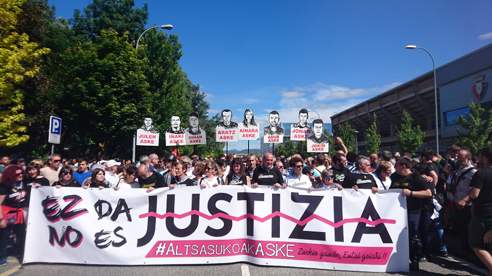 Este sábado, Pamplona se quedó pequeña para la multitud que volvió a pedir la libertad de este chico y de los otros seis que están en prisión –tres de ellos llevan allí un año y medio- por esa misma reyerta, en la que se vieron involucrados dos guardias civiles sin uniforme. Un tribunal les ha condenado a penas que van desde los dos hasta los 13 años de cárcel por unos hechos que inicialmente fueron catalogados como "terrorismo". La imputación se cayó tras el juicio, pero las penas fueron las más elevadas que se podían requerir por delitos de "lesiones, desórdenes públicos y amenazas".