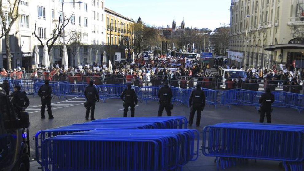 Convocados por la plataforma que aglutina las Marchas de la Dignidad, la protesta ha partido a mediodía de la Puerta del Sol y ha culminado, sin ningún tipo de incidentes casi dos horas después junto a la plaza de las Cortes, a pocos metros del Congreso, cuyo acceso estaba cortado al paso con vallas y un dispositivo policial menos numeroso que en otras ocasiones.