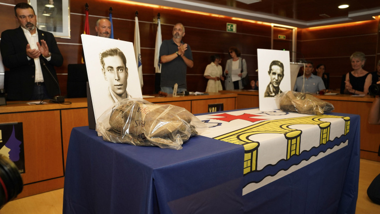 Los restos de ambos asesinados han entrado en el salón de plenos de Culleredo (A Coruña) con música de gaitas y han quedado cubiertos por sendas banderas gallegas y otras tantas rosas rojas, mientras sus familias los recibían visiblemente emocionadas y, además, han sido entregadas las botas de ambos, todavía bien conservadas. El emotivo acto ha acabado con el himno gallego.