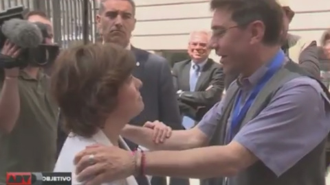 Monedero se dirigió ayer a Sáenz de Santamaría a la salida del Congreso tras la aprobación de la moción de censura contra Mariano Rajoy para decirle: "Me alegro de que os vayáis". "A mí no me alegra que lleguéis, pero esto es la democracia, ¿vale? Cuídate, hasta luego", le contesta Sáenz de Santamaría.