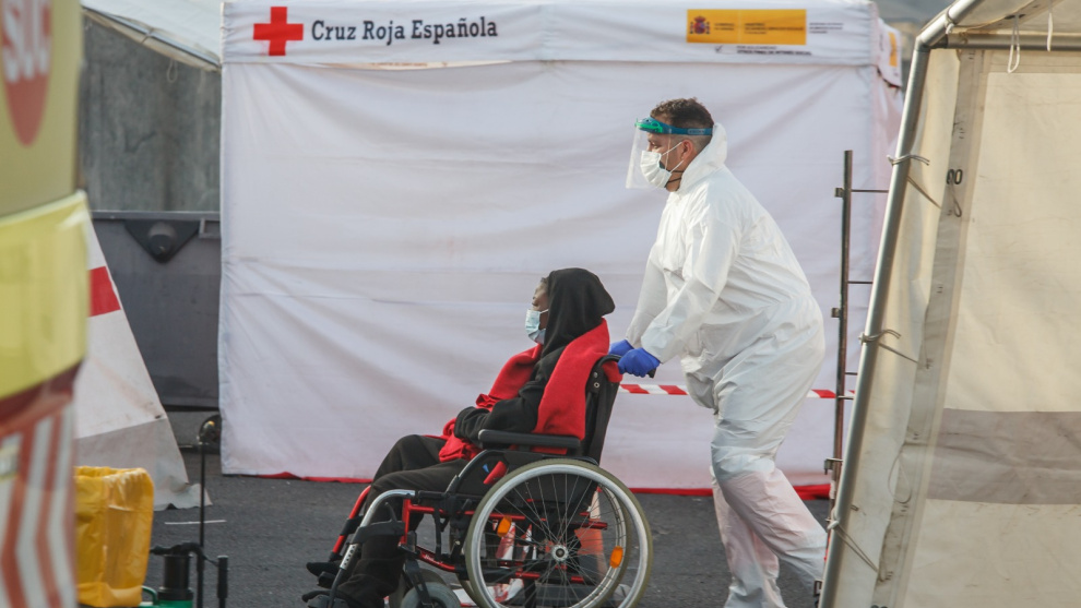Un trabajador lleva en silla de ruedas a una mujer que ha salido de la embarcación 'Guardamar Talía’ a su llegada al muelle de Arguineguín con varias decenas de migrantes, a 28 de agosto de 2021, en Arguineguín, Mogán, Gran Canaria, (España). Archivo. Europa Press