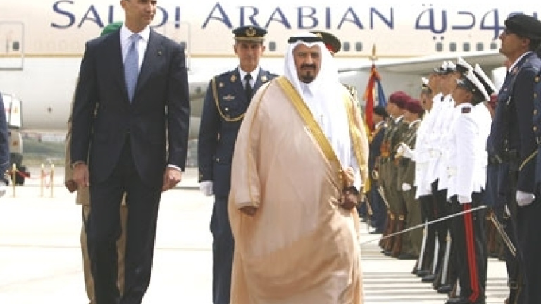 Hoy aterrizó en Madrid el lujoso Airbus del príncipe heredero de Arabia Saudí, que fue recibido por la mañana y a pie de escalera por el príncipe heredero de España junto a un séquito que no incluía a las, al menos, cuatro esposas que se le atribuyen. Pocos matrimonios si se tiene en cuenta que su tío, el rey saudí Abdullah, que visitó nuestro país en junio de 2007, tiene más de treinta.