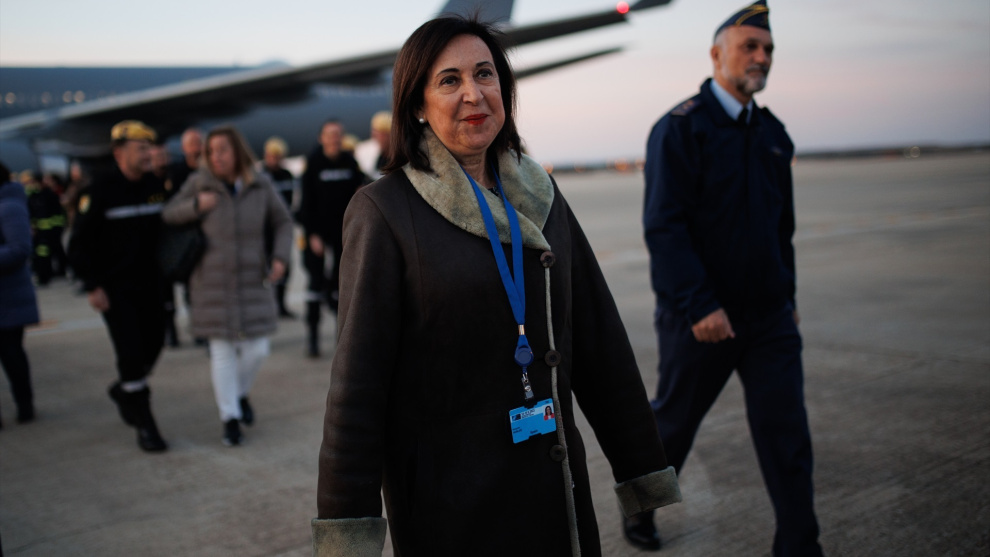 La ministra de Defensa, Margarita Robles, recibe a los efectivos recién llegados de Turquía, en Torrejón de Ardoz, a 15 de febrero de 2023. Alejandro Martínez Vélez / Europa Press