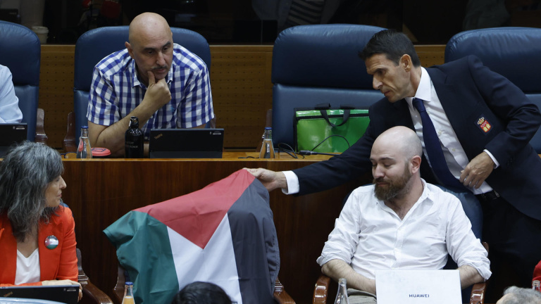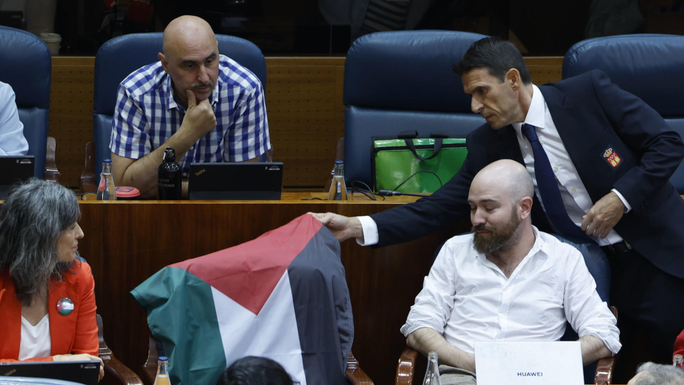 El PP obliga a retirar una bandera palestina puesta por Más Madrid en la Asamblea y compara la Flotilla con "hacer el indio"