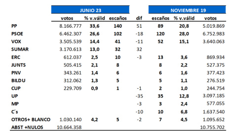 En este caso, los de Pedro Sánchez se sitúan a siete puntos del Partido Popular y bajan casi un punto y medio respecto a sus resultados en noviembre de 2019 (perdiendo también 18 escaños). "Las elecciones de mayo, la aparición del Movimiento Sumar, con la difícil integración de Podemos, y la precampaña, han permitido al PSOE recuperar votos y escaños", apunta Paz Álvarez, directora técnica de Key Data.