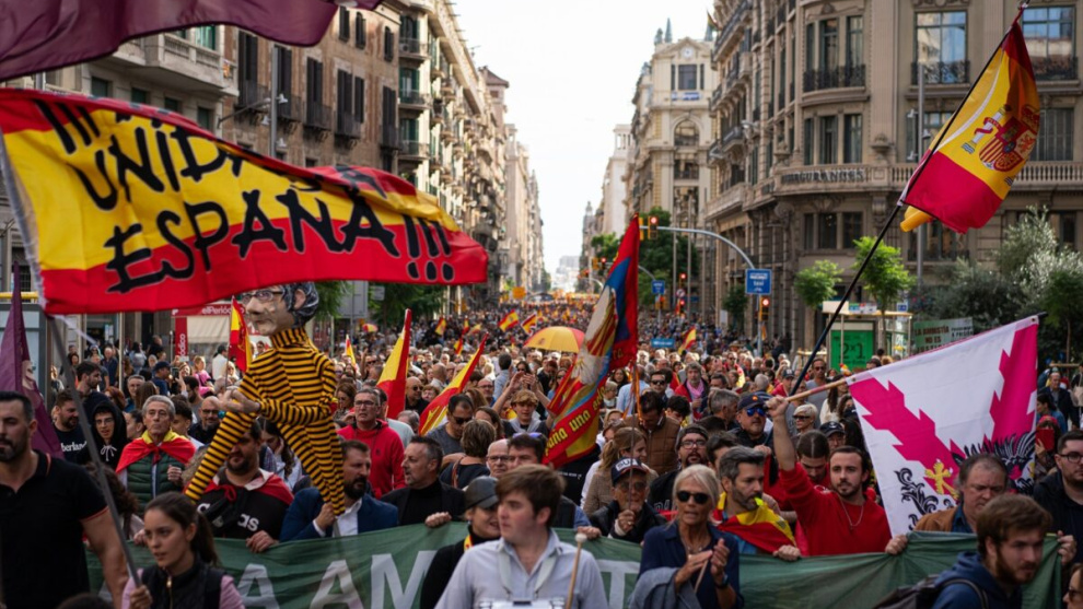 En el tiempo de descuento para un segundo debate, el Partido Popular ha convocado una manifestación simultánea y descentralizada en las cuatro provincias catalanas y en otras ciudades españolas como Madrid, Málaga o València. La concentración en Barcelona, organizada formalmente por la plataforma Cataluña Suma -que aglutina numerosas pero minoritarias organizaciones de la derecha españolista- ha reunido a dirigentes del PP, Ciudadanos y Vox, que se han situado en lugares distintos de la plaza para evitar una fotografía conjunta.