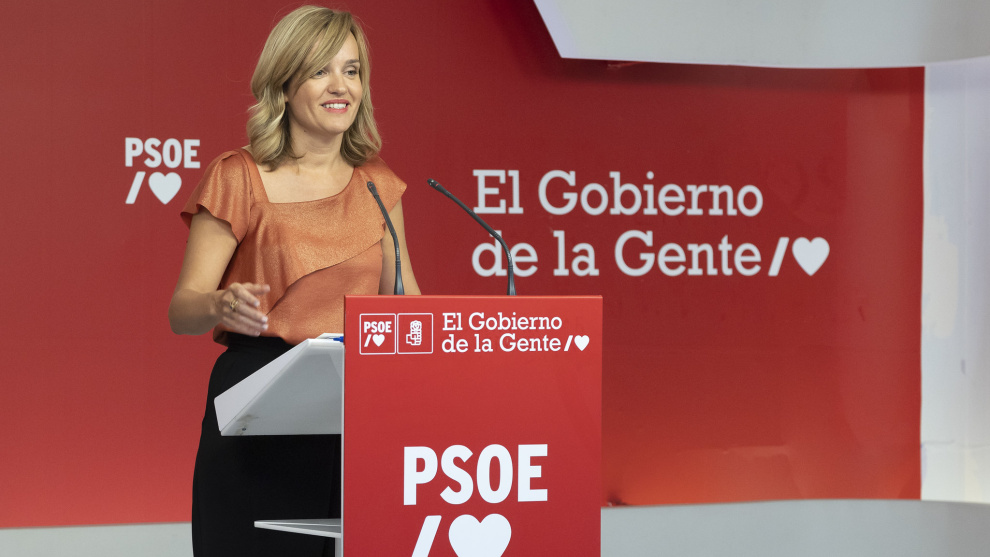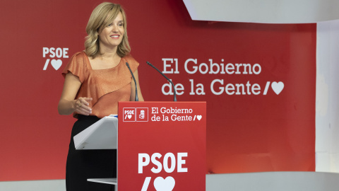 La portavoz de la CEF-PSOE y ministra de Educación y Formación Profesional, Pilar Alegría, ofrece una rueda de prensa en la sede de Ferraz. Eva Ecorlanese / PSOE