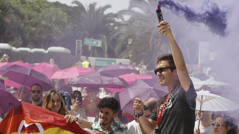 La bancada joven, poco numerosa pero muy ruidosa y visible con sus bengalas de humo morado, se reúne en la parte más caliente sin necesidad de protección. Y este sería el mejor resumen del público asistente: viejos militantes incombustibles, jóvenes llenos de energía y un cierto vacío en la mediana edad. Curiosamente aquella gente que hace 11 años, con veintintantos, protagonizaron el 15-M.