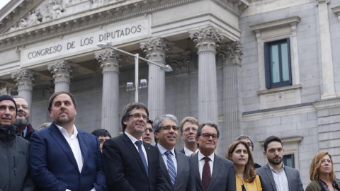 El presidente de la Generalitat y dirigentes del PDECat y ERC, como Artur Mas y Oriol Junqueras, han participado en un acto de apoyo a Homs en el Congreso de los Diputados.