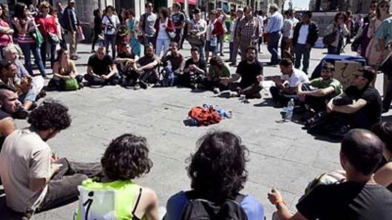 MADRID.- Rodeados de turistas, vecinos curiosos y viandantes asombrados, decenas de jóvenes participantes en la manifestación de ayer permanecían hoy acampados en la puerta del Sol de Madrid, después de haber pasado la noche allí, a la intemperie, con cuatro mantas y algo de comida. Ayer, después de los altercados entre manifestantes y policía que terminaron con varios heridos y 24 estudiantes detenidos, varios grupos crearon de forma espontánea el nuevo movimiento ya conocido en Twitter como #acampadasol. Su intención es organizarse, realizar turnos de estancia en la céntrica plaza madrileña y permanecer allí, protestando, hasta el próximo domingo 22, día de las elecciones.