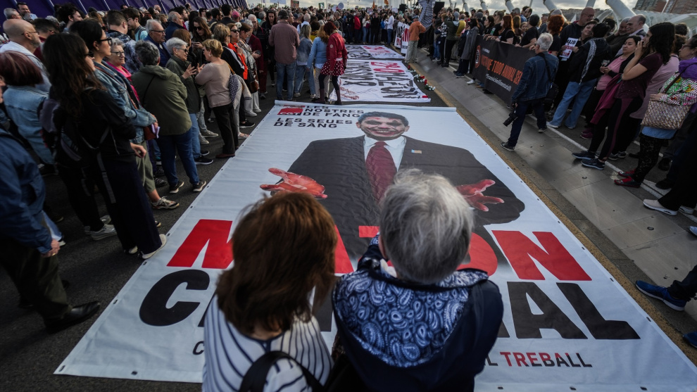 La cita —no tan multitudinaria como las anteriores manifestaciones en el centro de la ciudad, obviamente, pero sí bien nutrida— sirvió para presentar el Acuerdo Social Valenciano, que impulsan los Comités de Reconstrucción Local, sindicatos como Intersindical, CGT o CNT, así como otros actores sociales, que han convocado una huelga general en todo el País Valencià para el próximo 29 de mayo.