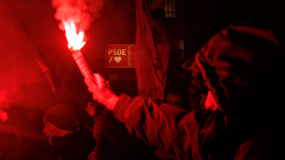 La protesta de la extrema derecha acabó con el falangista Manuel Andrino –uno de los condenados por el asalto a la librería Blanquerna en 2013– encabezando el canto del "Cara al sol" y haciendo el saludo fascista delante de la sede del PSOE, con el logo y las siglas socialistas de fondo.
