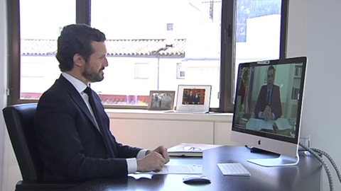 Imágenes de la reunión por videoconferencia entre el presidente del PP, Pablo Casado, y el presidente del Gobierno, Pedro Sánchez.