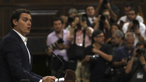 Mariano Rajoy no ha acudido todavía al pleno del Congreso de los Diputados donde se celebra la segunda jornada del debate de la moción de censura presentada por Unidos Podemos contra el Gobierno. Pero no le ha hecho falta. En su lugar, fue su socio de Ciudadanos, Albert Rivera, quien arremetió contra Pablo Iglesias.