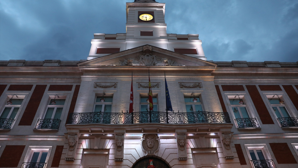 Fachada de la Real Casa de Correos iluminada, a 2 de agosto de 2022, en Madrid. Isabel Infantes / Europa Press