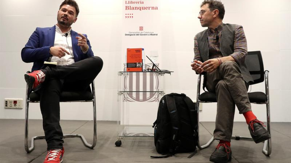 Gabriel Rufián invitó este lunes a Juan Carlos Monedero a la librería Blanquerna de Madrid para que le "presentara" el libro, y la "cita" derivó en un profundo debate sobre dos formas de ver, analizar y afrontar la situación de la izquierda en el país. A modo de experimento a pequeña escala, donde las voladuras, por suerte, son controladas, Rufián y Monedero pusieron cara a dos "izquierdas" que comparten análisis, objetivos, preocupaciones y adversarios en la teoría, pero cuyos caminos parecen separarse en la cotidianidad y el día a día.